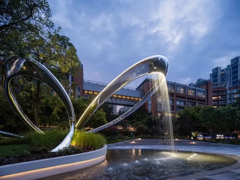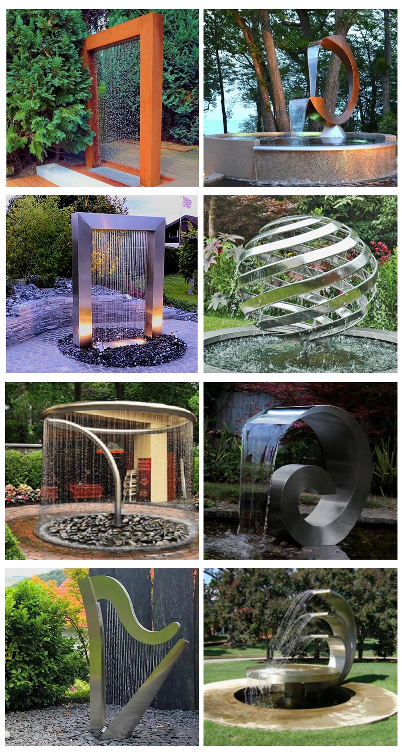 This large metal water feature is forged from high-quality stainless steel and is suitable for decoration in various outdoor spaces, bringing a modern artistic atmosphere to people’s lives.